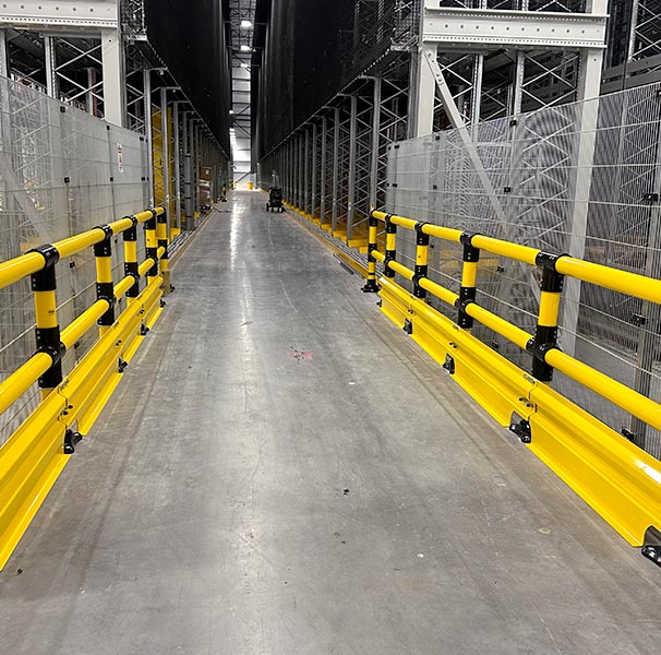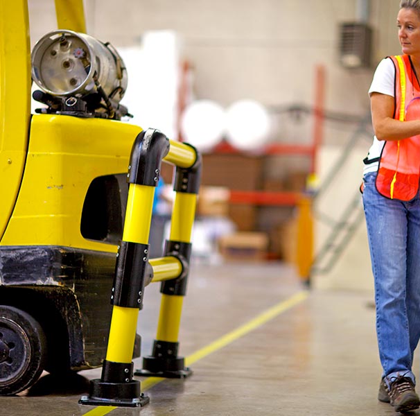 Use guardrails and fork plate protectors to create safe walkways and prevent collisions between pedestrians and moving equipment.